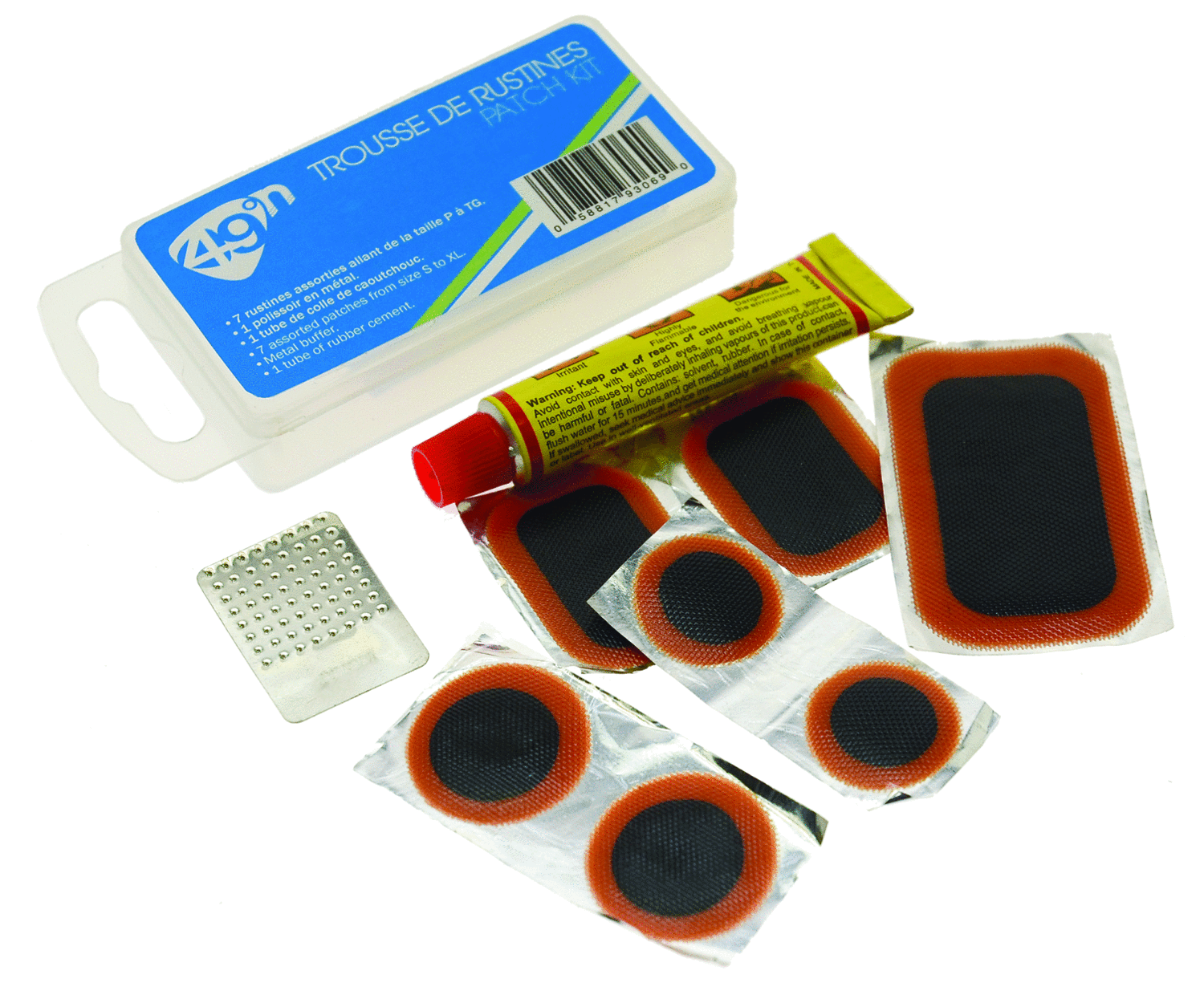Trousse de Rustines vélo de 49N contient 7 patch (autocollant) avec un polissoir en métal, un tube de colle caoutchouc, pour la réparation de crevaison de pneu vélo. Achat en ligne ou à notre magasin de Québec au Canada.