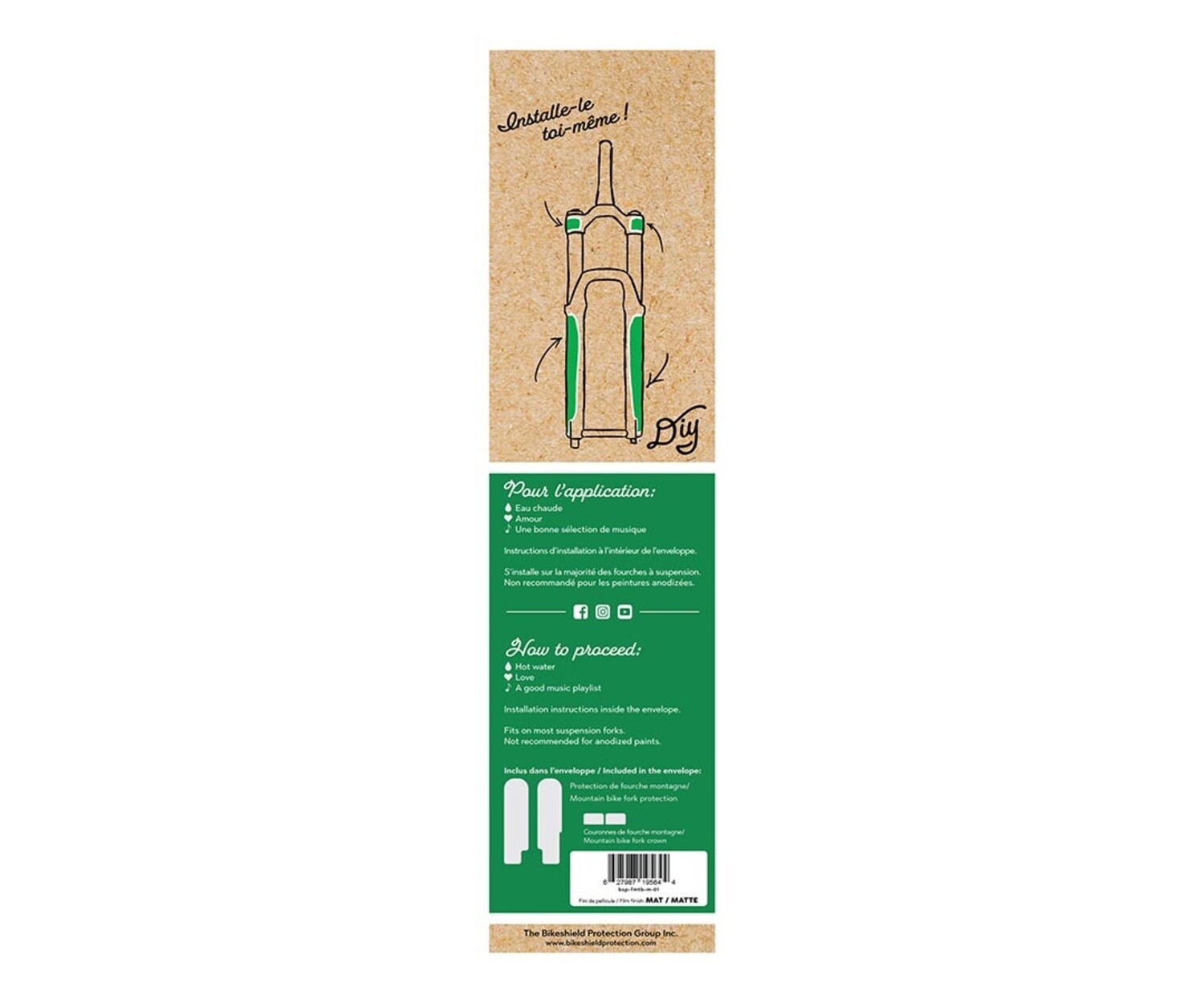 Pellicule de protection Fourche MTB de BIKESHIELD, flexible, résistante, facile à installer, fini lustré ou mat. Idéal pour préserver la couleur et protéger des égratignures la fourche vélo. Achetez en ligne ou à notre magasin de Québec au Canada.