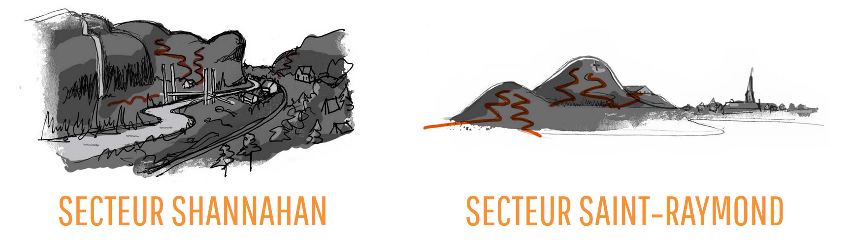 Tel qu’affirmé sur leur site web, deux secteurs, deux expériences! Le premier réseau, tout près de la rue principale du village, est le secteur St-Raymond. Celui-ci regroupe 30 km de sentier ‘’single track’’. On se retrouve dans un décor campagnard, à dévaler des sentiers sur deux petites montagnes. Les descentes sont courtes, ainsi que les ascensions. Spécialement du côté du Mont Laura, où le réaménagement récent de la montée donne accès au sommet rapidement, sans aucun défi technique. De nouvelles et très courtes descentes, la Mauvaise et la Gombi, viennent rehausser le niveau de difficulté du réseau. Avec ces deux lignes comprenant des descentes de roches très abruptes et techniques, ceux qui aiment se faire peur sont maintenant rassasiés. Entre les autres descentes en majorité ‘’flowy’’, on peut emprunter des chemins de niveau débutant à travers des champs, ou faire un détour en forêt sur un terrain plus accidenté. Mais ici, la valeur sûre appartient plutôt à la catégorie Enduro!