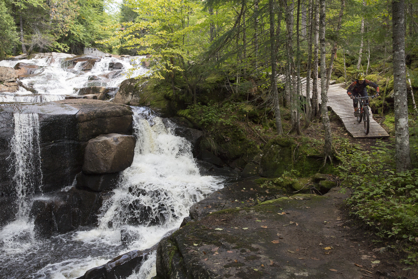 Un point que j’aime bien c’est qu’en général, les sentiers experts n’ont pas été pensés d’une manière égoïste; il y a pratiquement toujours une ligne intermédiaire pour éviter les plus gros défis tout en profitant quand même du terrain. Par exemple, la piste La Légende, qui offre une descente en roche à même une chute, vous permet d’accéder à cette section via une série de ‘’drops’’ et de ‘’slabs’’. Sinon, vous pouvez y accéder via un sentier alternatif beaucoup moins risqué mais toujours trippant. Cette fameuse section de quelques centaines de mètres se termine là où la chute plonge dans le vide, laissant place à un paysage complètement fou. À mon humble avis, c’est la plus belle section de piste dans la province.