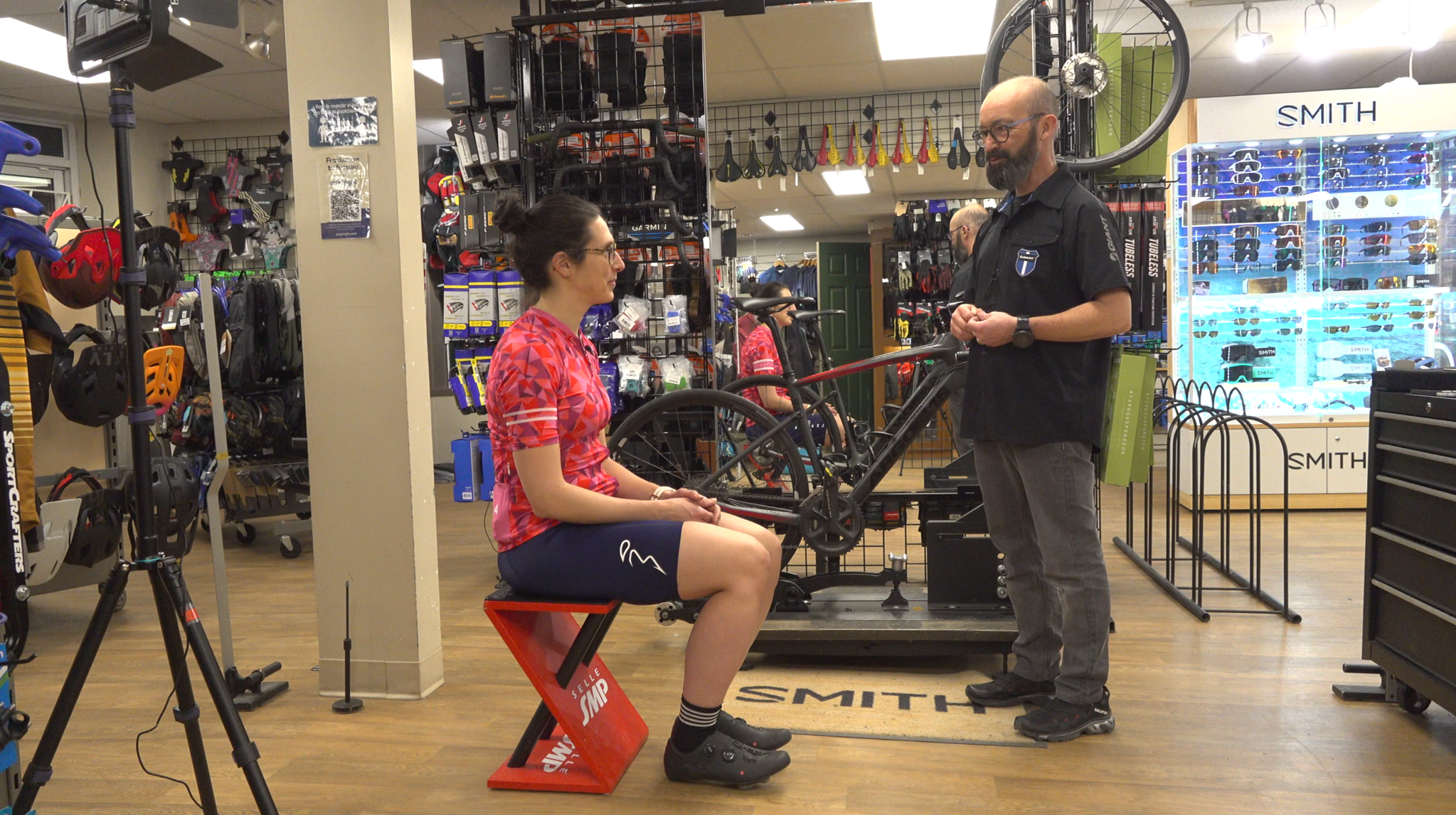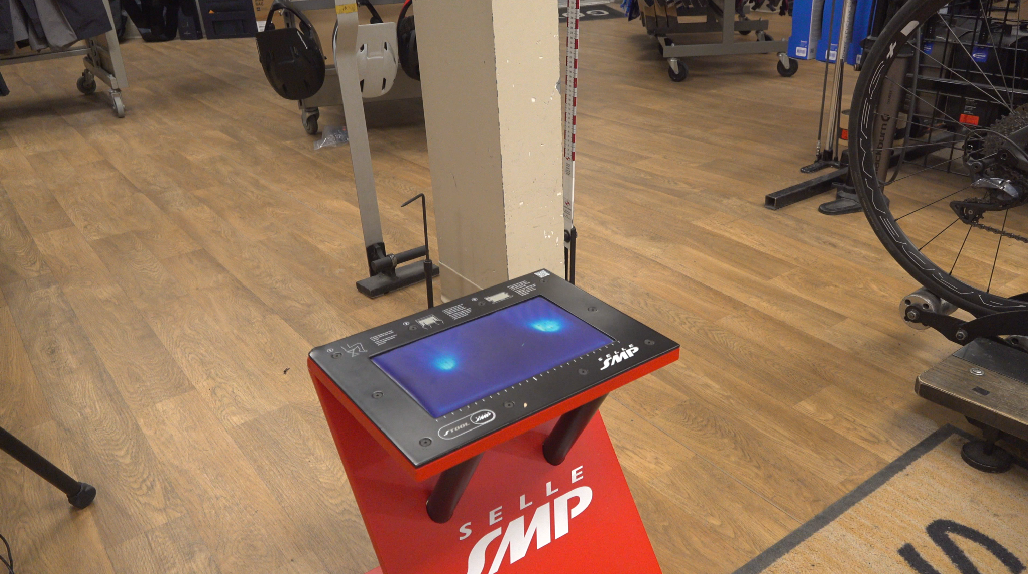 Au départ, on a jasé un peu de mon expérience en tant que cycliste, de mes attentes et de mes besoins. Ensuite, après m’avoir regardée pédaler et avoir fait quelques minimes ajustements sur mon positionnement, Benoît a mesuré la distance entre mes ischions (partie inférieure des os du bassin) avec un appareil simulant une selle en mousse mémoire. Une fois cette donnée recueillie, il m’a fait essayer plusieurs selles, de types différents, pouvant accommoder divers traits anatomiques et profils de flexibilité chez un cycliste. Vous vous en doutez bien, mais il existe une panoplie de selles et tenter de s’y retrouver sans un expert en la matière peut être une tâche assez fastidieuse. Il y en a des coussinées, des plus dures, certaines dont le bec est plus court, d’autres avec un trou au centre ou avec l’arrière plus relevé, etc.