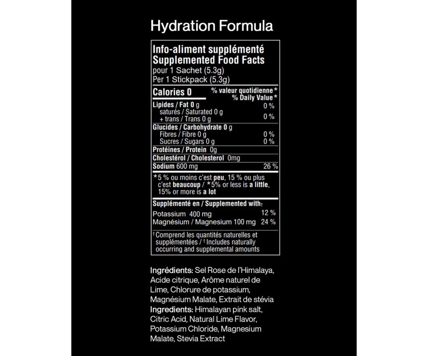 - Sodium : Aide à maintenir la balance des fluides et l'équilibre électrolytique du corps en retenant l'eau, favorisant ainsi l'hydratation par osmose