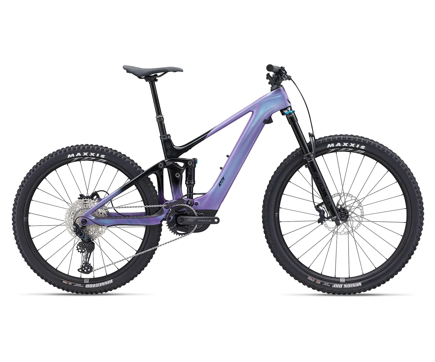 Ce LIV Intrigue X Advanced E+ ELITE 2 2026 est un vélo de montagne All-mountain, haut de gamme électrique, double suspension 140/150mm, cadre en carbone, tige de selle ajustable, roues mixtes de 27,5 et 29 pouces, monté en Shimano SLX, batterie 400Wh. Achetez E-bike VTT, en ligne ou à notre magasin de Québec au Canada.