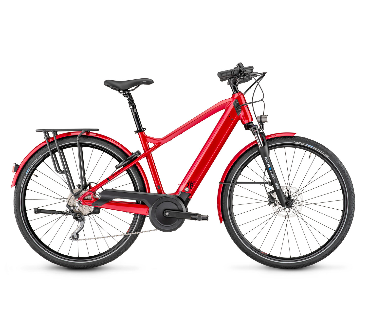 Avec son cadre à la fois confortable et dynamique, l'intégration de la batterie Bosch PowerTube 500Wh, son moteur Bosch Performance Line souple et puissant, une suspension agréable avec sa fourche de 63mm débattement et sa tige de selle suspendue offrant 40mm de confort supplémentaire, son fameux cintre relevé Moustache pour une posture confortable, son porte-bagages pratique et ses garde-boue peints pour un style inimitable, Samedi 28.5 est une parfaite alternative à la voiture et vous mènera dans tous vos déplacements quotidiens !