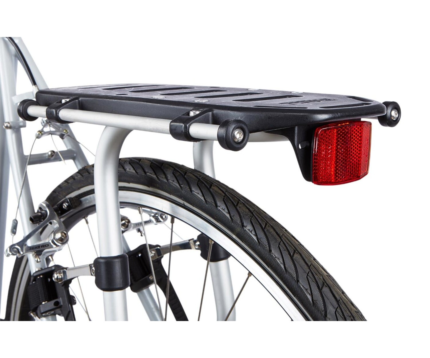 Le porte-bagages reste bien en place en présence de charges lourdes grâce aux attaches caoutchoutées qui l’empêchent de glisser et qui protègent le cadre du vélo.